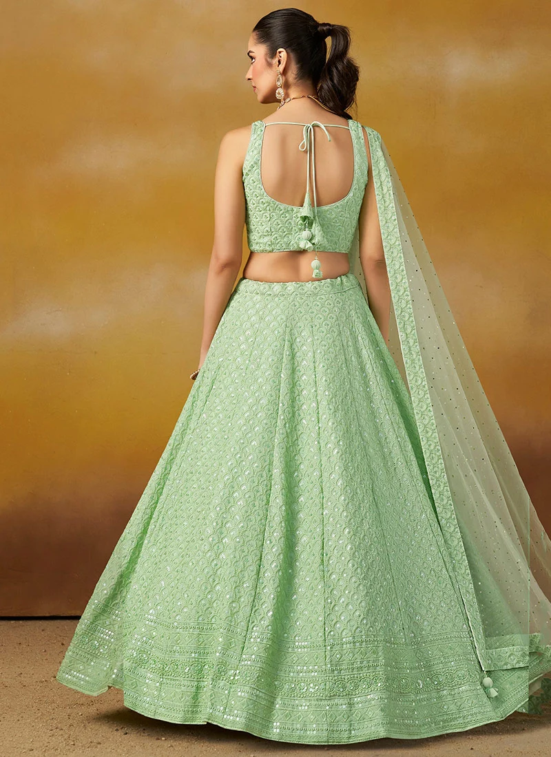 Mint Green Georgette Sequins Thread Embroidered Lehenga Choli