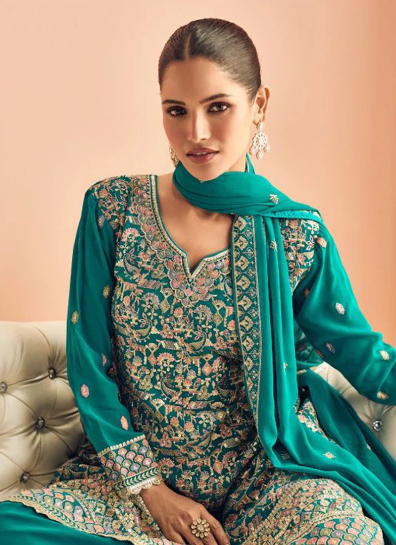 Attract compliments by this rama georgette trendy salwar kameez. The amazing attire creates a dramatic canvas with fantastic embroidered work. Comes with matching bottom and dupatta.