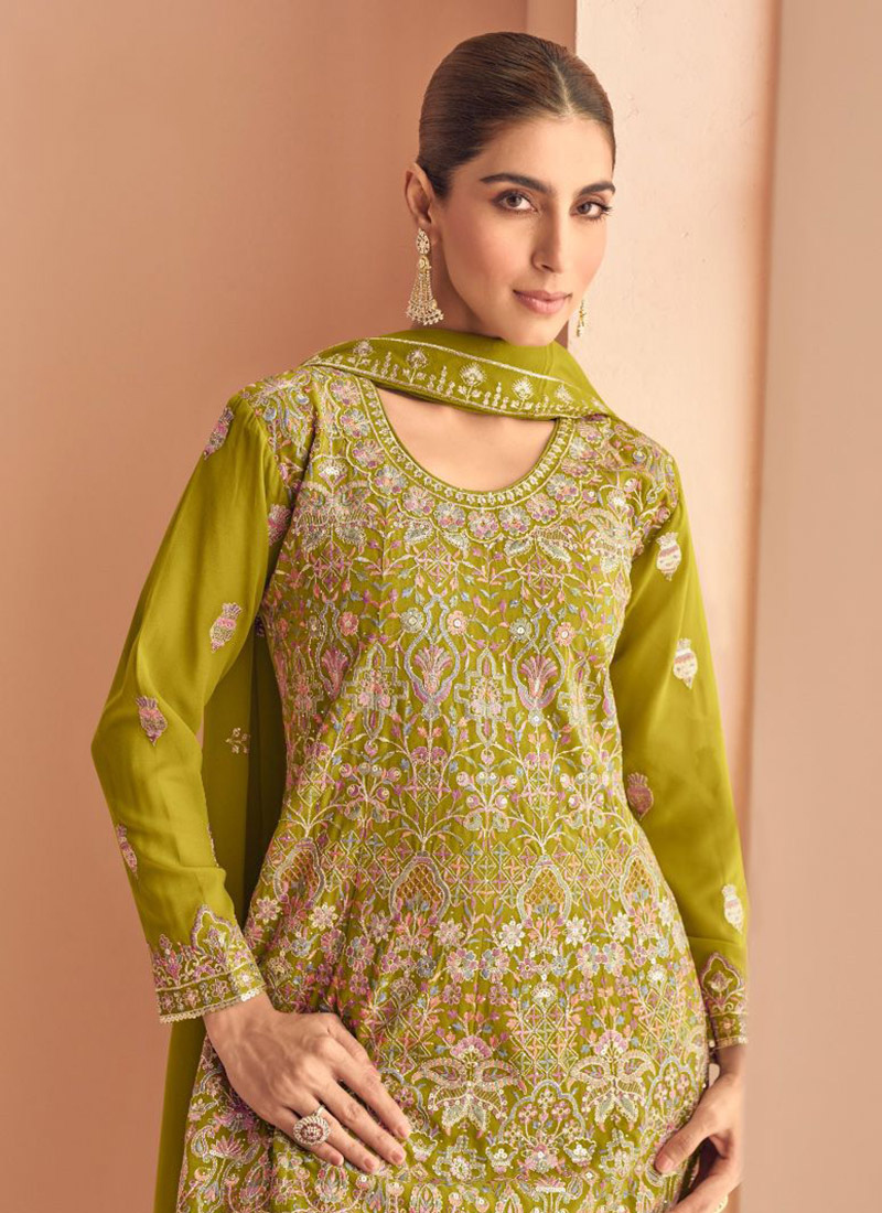 This yellow palazzo suit presents a graceful and vibrant look that is perfect for festive and celebratory moments. Crafted in soft georgette fabric the outfit offers a light and flowy drape that enhances comfort and elegance. The embroidery with sequins and thread work adds a subtle shimmer that catches the light beautifully while maintaining a refined appearance. The a line silhouette gives a flattering shape that suits different body types with ease. The top features a round neck at both front and back with a balanced depth that keeps the design modest yet stylish. The full sleeves complement the overall look without overpowering the outfit. The calf length style adds a contemporary touch while still keeping a traditional essence. The detailing is carefully placed to highlight the craftsmanship without making the design look heavy. The bottom and dupatta are made from the same color fabric which creates a coordinated and seamless appearance. The flow of the palazzo adds movement and comfort making it suitable for long hours of wear. The dupatta completes the outfit with a soft and elegant finish enhancing the overall charm of the attire. Ideal for occasions like diwali eid bhai duj party wear and raksha bandhan this outfit blends tradition with modern style. It offers a perfect balance of comfort and elegance making it a versatile choice for festive gatherings and special events.
