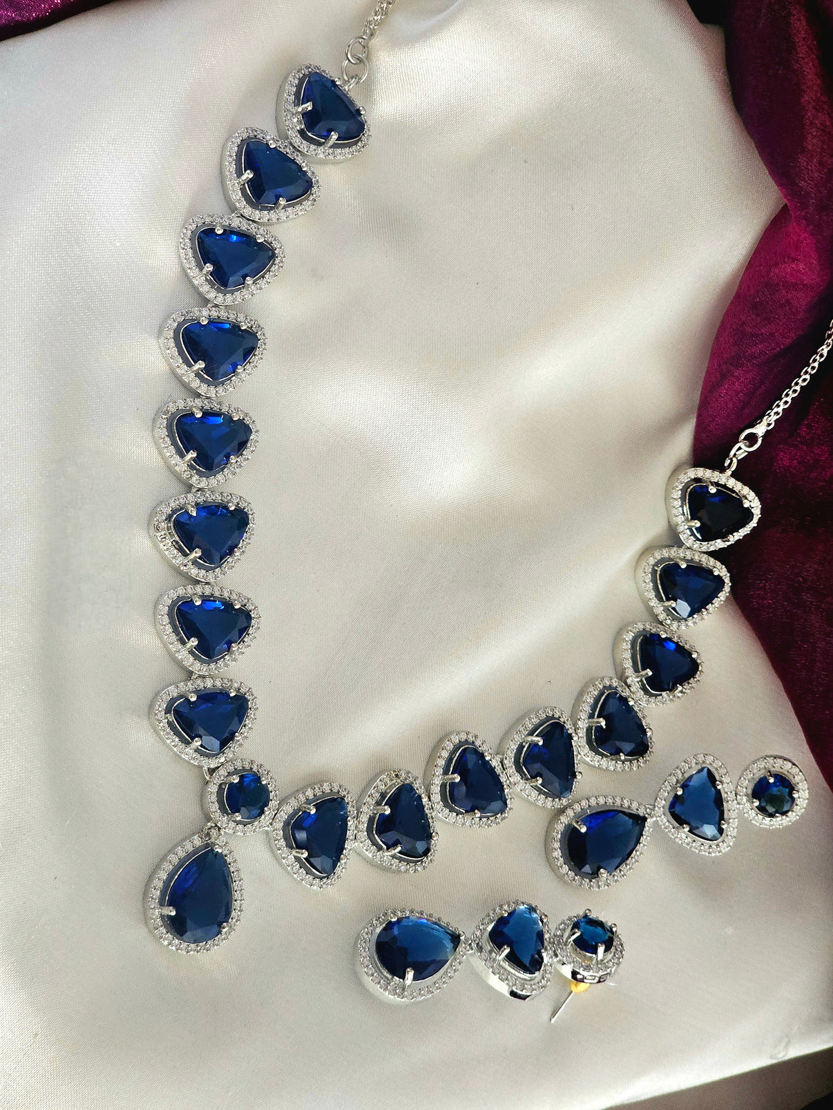 Radiating elegance, this blue American diamond necklace set comes with matching earrings, adding a touch of regal charm and sparkle to your party or festive look.